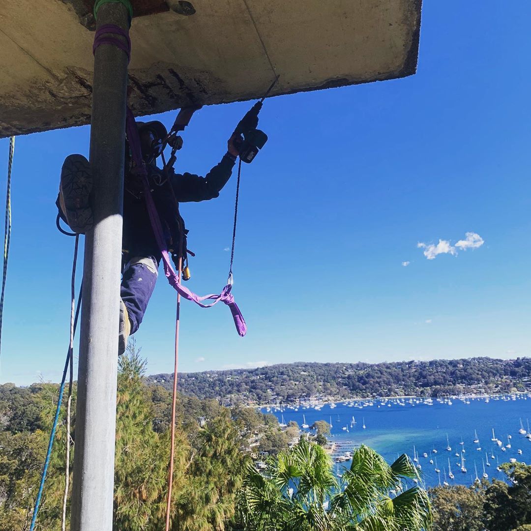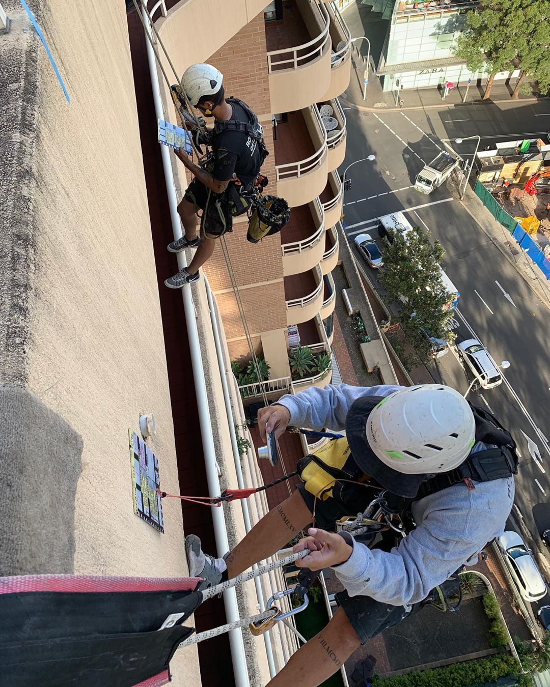 Boys hard at it today, render repairs, waterproofing and then fresh coat of paint. #petzlprofessional #petzl #ropeaccess #ropetech